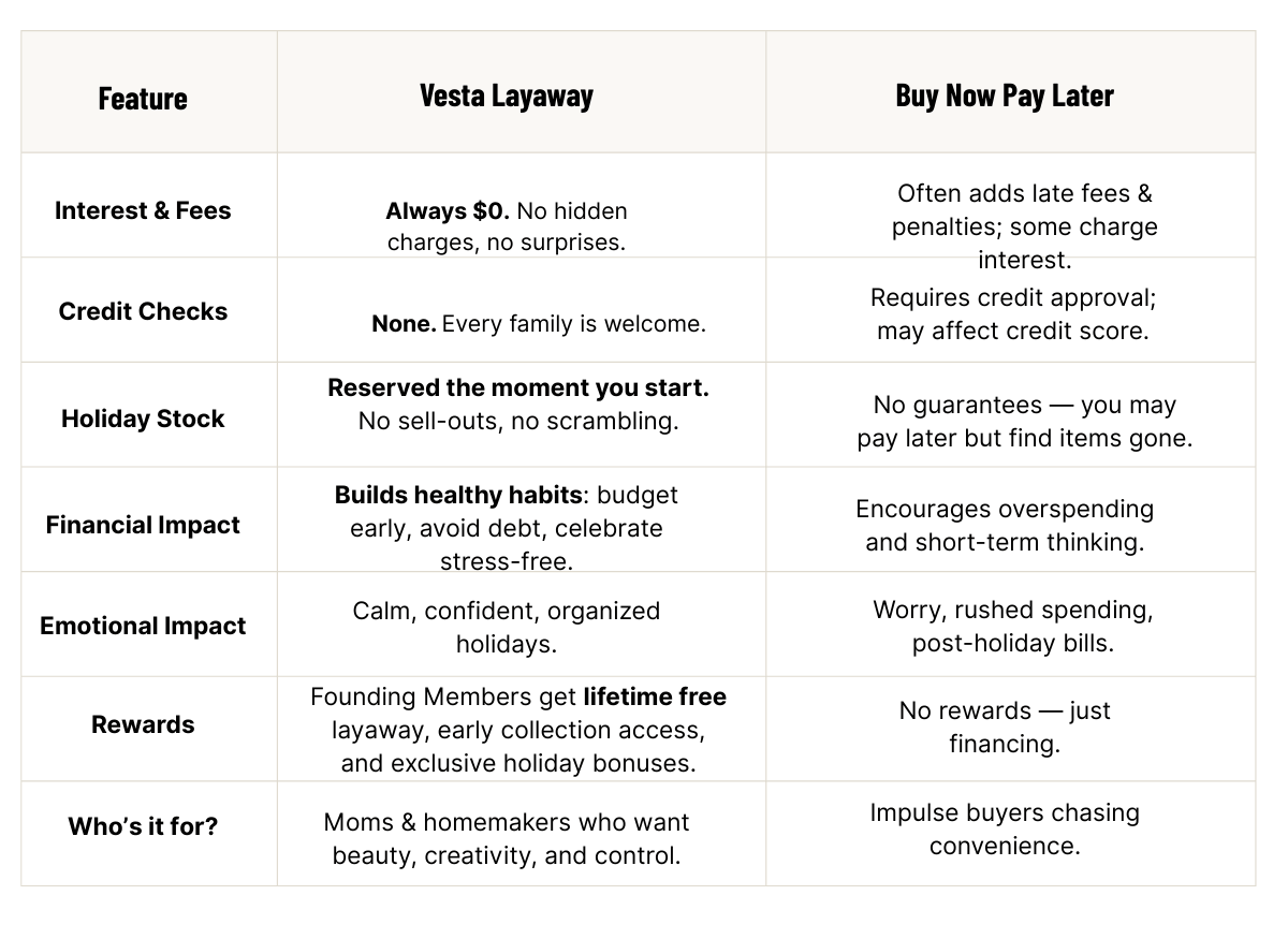Vesta’s Layaway Program is built for homemakers who want to stay organized, avoid debt, and feel proud of creating magical celebrations — without the financial pressure.