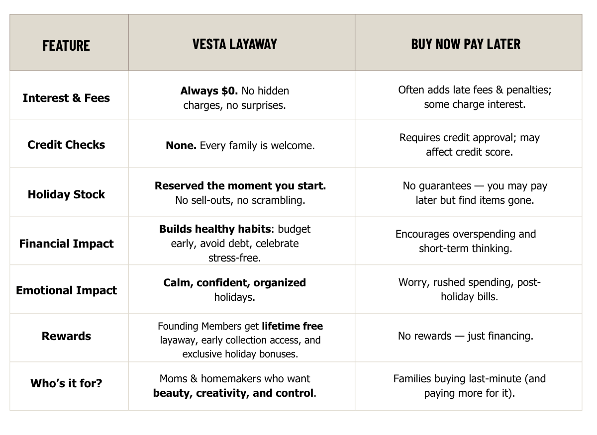 Plan every holiday ahead of time with flexible payments — always $0 interest, $0 fees, and no credit checks. Ever.